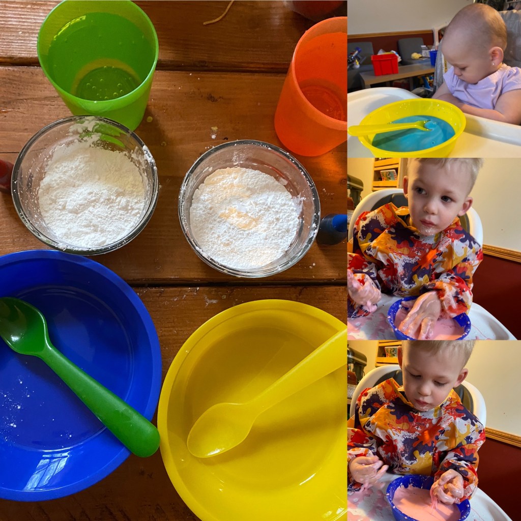 Today during virtual mommy and me we made Oobleck! This super fun and messy experiment is a really sensory/soothing experiment for kiddos of all ages (including the parents)! This simple experiment only takes 3 ingredients (only 2 are necessary really). As always prep prep prep super important so you are ready to go when your kiddo gets involved. What you will need for this is cornstarch, water and food coloring (the food coloring is just fun but not necessary if you don’t have any). I used some paint bowls that I got at Lakeshore Learning to make this in and gave my kiddos some spoons to stir with as well as little plastic cups with water in it. I like to let them as hands on in making process as possible so they really engaged. Start with about a half cup of cornstarch and then let your kiddo add water (and drops of food coloring) until you get a consistency that looks liquid but is solid once you start to pick it up. When you let it drip into the bowl it should have a jiggly slime consistency. You may have to add more cornstarch as well to get the correct consistency. Put those hands in there and enjoy your jiggly, slimy, goopy oobleck! Below is a video of us experimenting! You can see in the video the consistency you are going for.